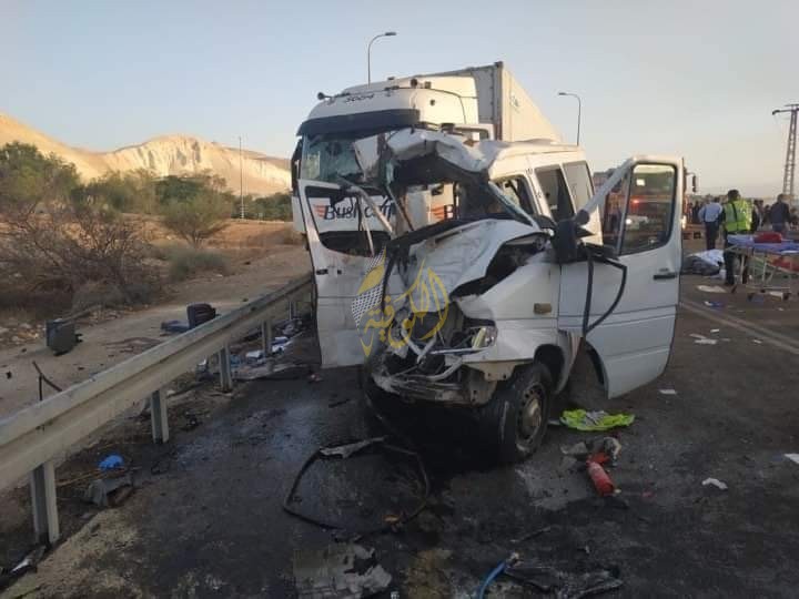 الكوفية أريحا|| أفادت مصادر عبرية بمصرع 6 عمال فلسطينيين وأصيب أربعة اخرون بجروح خطيرة للغاية عقب تصادم شاحنة وسيارة نقليات على طريق 90/ قرية فصايل اريحا صباح اليوم.
