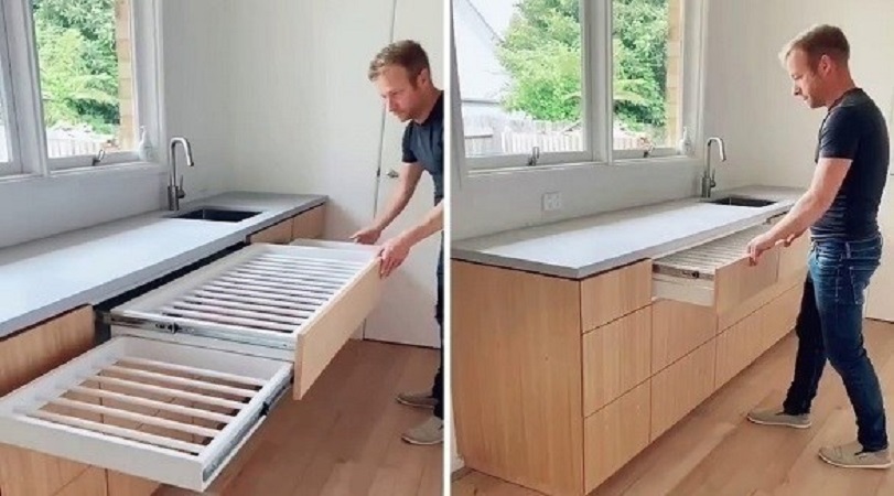 وكالات: كشف مهندس معماري كيف قام بتصميم منشر غسيل لتجفيف الملابس تحت حوض الجلى في المطبخ.