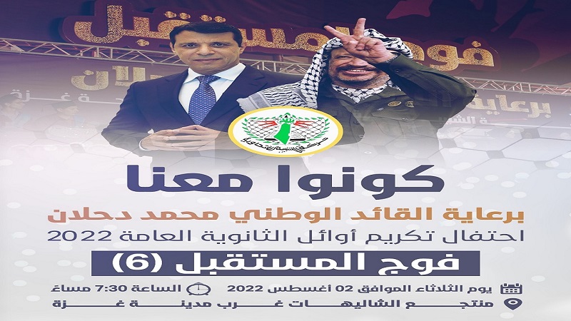 غزة: ينظم تيار الإصلاح الديمقراطي في حركة فتح، غدًا الثلاثاء، مهرجانًا مركزيًا لتكريم أوائل الثانوية العامة، في منتجع الشاليهات غرب مدينة غزة، برعاية القائد محمد دحلان.