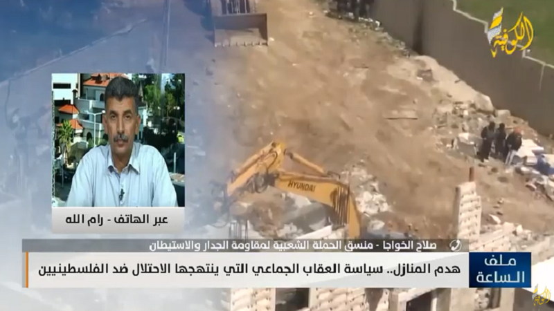 وأكد الخواجا، خلال لقائه في برنامج «ملف الساعة»، على قناة «الكوفية»، اليوم الخميس، أن سلطات الاحتلال واصل سياستها في الهدم ومصادرة الأراضي وملاحقة المواطنين.