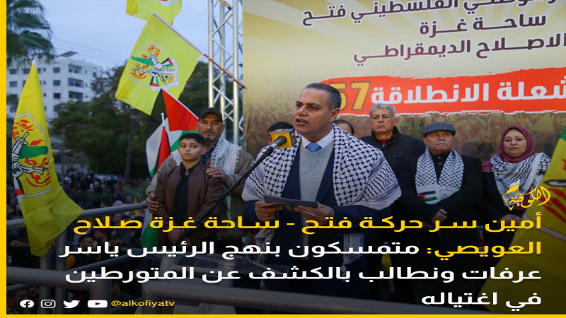 غزة: قال أمين سر حركة فتح - ساحة غزة، د. صلاح العويصي ، إننا "متمسكون بنهج الرئيس الرمز ياسر عرفات ونطالب في ذكرى رحيله بالكشف عن المتورطين في اغتياله"