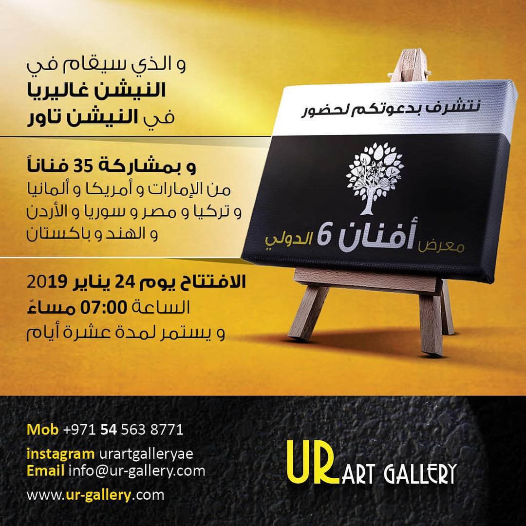 أبو ظبي: ينطلق في أبوظبي، معرض "أفنان 6 الدولي"، في النيشن تاور، بتنظيم "أور آرت" غاليري، مساء 24 يناير(كانون الثاني) الجاري، بمشاركة 35 فناناً من الإمارات، وأمريكا، وألمانيا، ومصر، وتركيا، والأردن، والهند، وباكستان، وسوريا، ويستمر حتى 2 فبراير (شباط) المقبل.