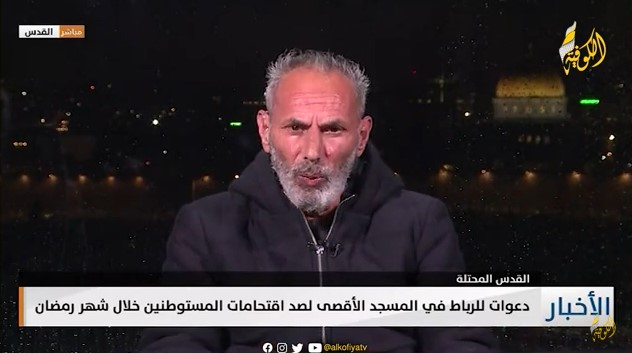 وأضاف، أن حكومة الاحتلال تحاول إشعال الأوضاع في المسجد الأقصى خلال شهر رمضان، داعيا الشعب الفلسطيني كافة إلى الرباط داخل المسجد الأقصى طوال الشهر الكريم من أجل التصدي لاقتحامات المستوطنين.