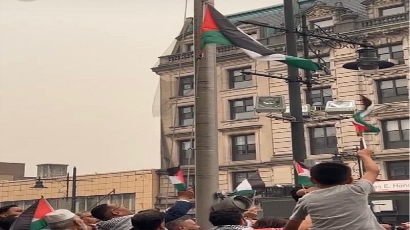 الاحتفال برفع العلم الفلسطيني على مبنى بلدية باترسون في الولايات المتحدة