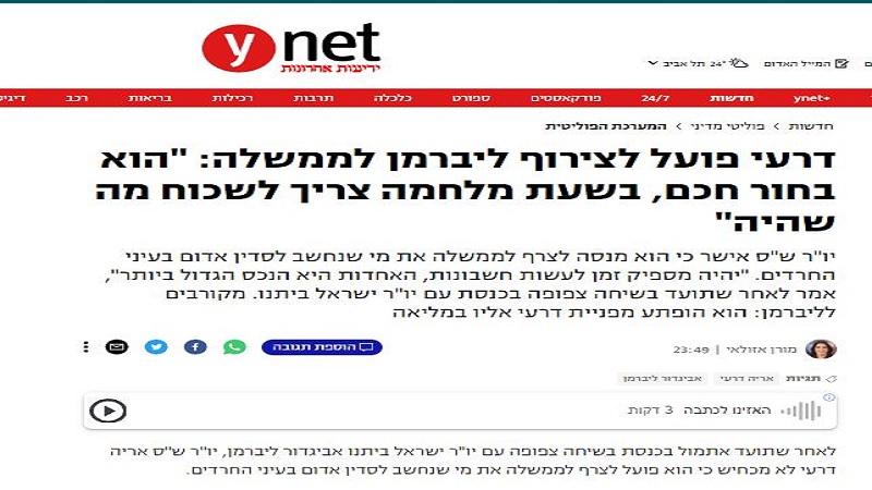 وقال أدرعي، في مقابلة مع إذاعة "كول حي" التابعة للحريديم، أحاول الآن أن أضم ليبرمان إلى الحكومة.. علينا أن نفعل كل شيء لهزيمة أعدائنا.
