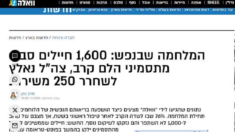 ترجمة للكوفية: ذكر موقع "واللا" العبري، إنه حصل على بيانات شبه رسمية تشير إلى تعرض أكثر من 1600 جندي وضابط لصدمة نفسية جراء الحرب فى غزة.