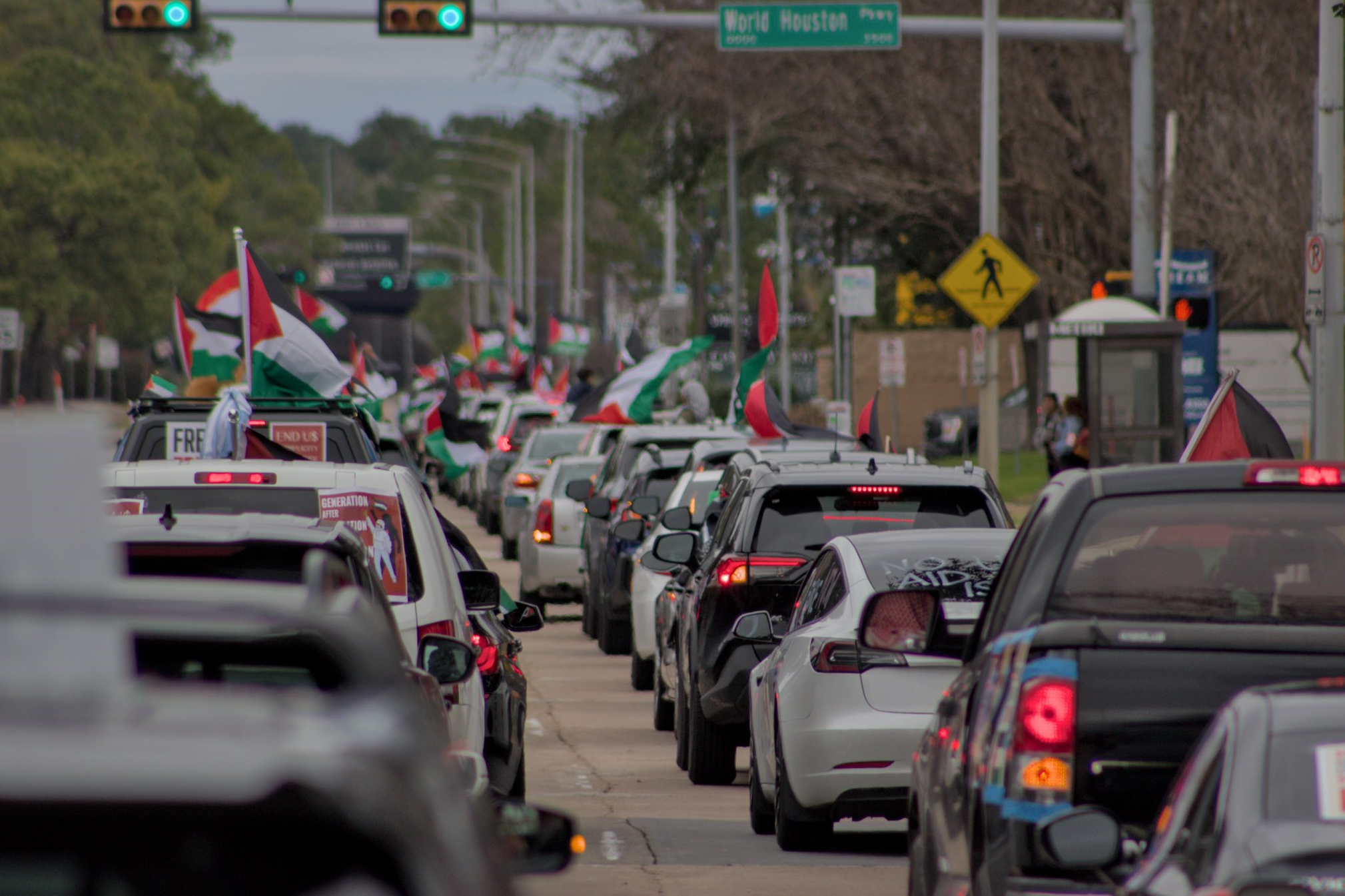 وفي السياق ذاته، خرجت في مدينة هيوستن بولاية تكساس مسيرة مركبات ضخمة رفع عليها العلم الفلسطيني واليافطات المطالبة بوقف الحرب، حيث أغلق المحتجون الشوارع المحيطة بمطار جورج بوش الدولي.