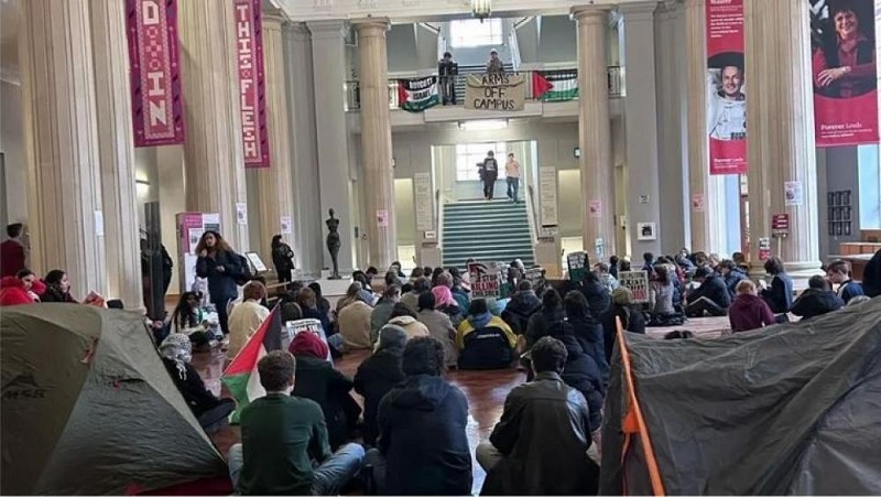 وأعلن الطلاب، الخميس، بدء اعتصام لأجل غير مسمى في مبنى باركنسون بالجامعة حتى الاستجابة لمطالبهم، وقد علقوا الأعلام الفلسطينية ولافتة كبيرة كُتب عليها: "الأسلحة خارج المقر الجامعي".