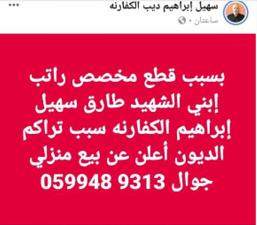 المواطن سهيل الكفارنة (46 عامًا) ،والد الشهيد إبراهيم الكفارنة (22 عامًا)،الذي أرتقي في سبتمبر/ أيلول عام 2012، جراء قصف إسرائيلي استهدفه أثناء إسعافه جرحى في بلدته،عرض منزله للبيع خلال منشور له عبر صفحته بالفيسبوك ، بعد تراكم ديونه وعجزه عن سداد أقساط منزله بسبب قطع السلطة الفلسطينية راتب نجله الشهيد.
