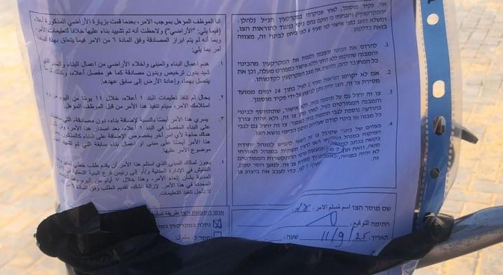 وذكرت منظمة البيدر للدفاع عن حقوق البدو، أن الإخطار جاء بتاريخ 10 من الشهر الماضي، عقب تحريض من مؤسسة "ريغافيم" الاستيطانية، التي ادعت أن المدرسة أُقيمت على أراضٍ مصنفة كمحمية طبيعية، ووجّهت أوراقًا إلى وزارة البيئة الإسرائيلية والإدارة المدنية وحكومة الاحتلال تطالب بهدم المدرسة.