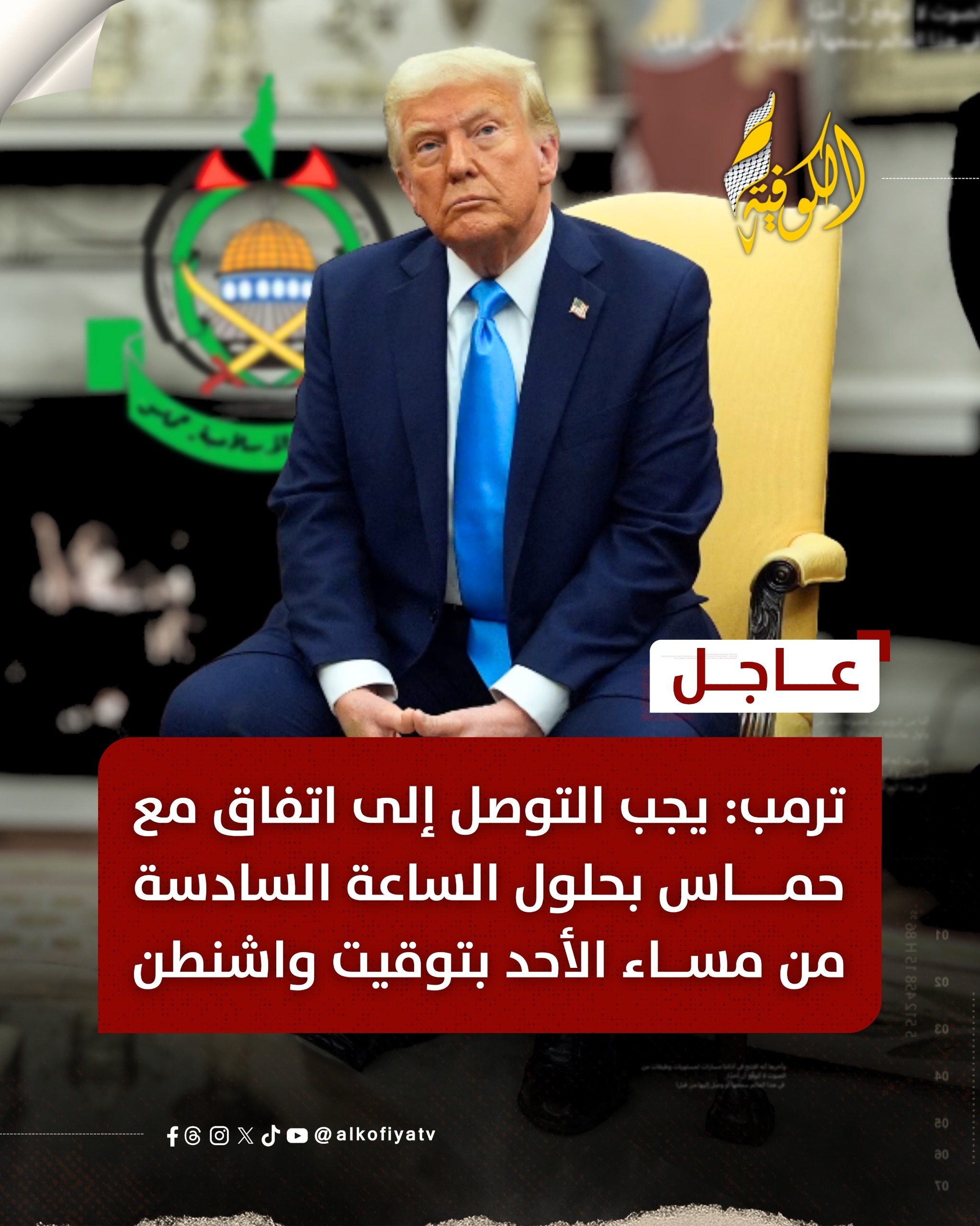 وقال ترامب إنه يجب التوصل إلى اتفاق مع حركة حماس بحلول الساعة 6 مساء الأحد بتوقيت واشنطن العاصمة.