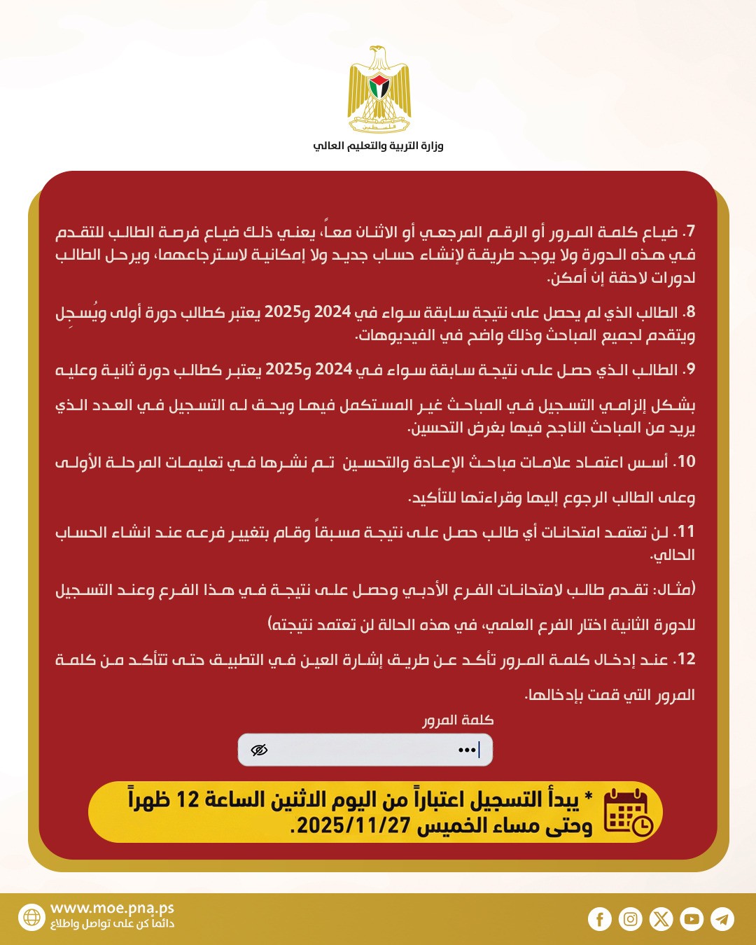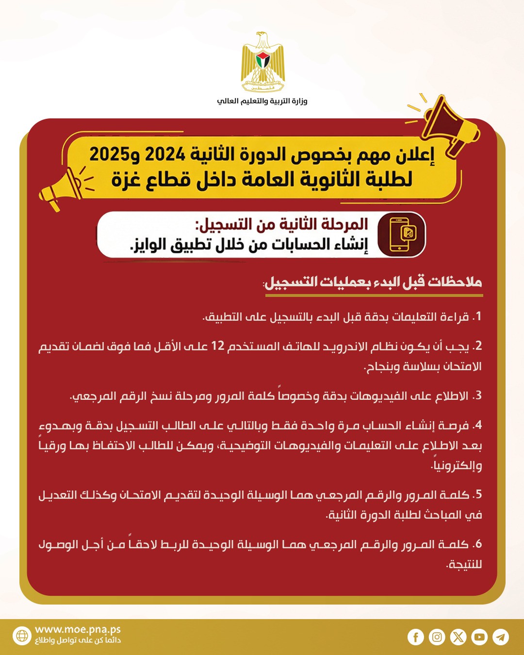 الكوفية متابعات: أصدرت وزارة التربية والتعليم العالي في فلسطين، اليوم الإثنين، 24 نوفمبر 2025، إعلانًا مهمًا بخصوص الدورة الثانية 2024 و2025 لطلبة الثانوية العامة داخل قطاع غزة .