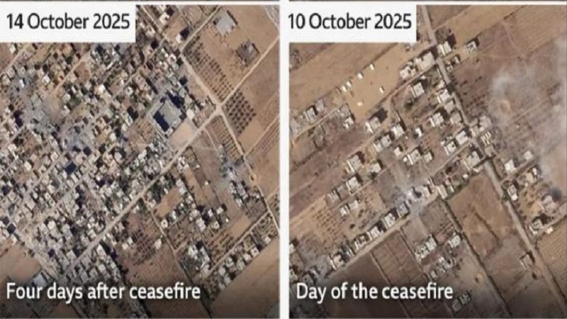 ووفق صور التقطتها شركة Planet Labs الأسبوع الماضي، ومقارنتها مع صور التقطت بعد أيام من بدء وقف النار، تبين أن مئات المباني قد هدمت وسويت بالأرض. وأوضحت صحيفة "هآرتس" أن قسمًا من هذه المباني كان قد تضرر خلال الحرب، لكن الآليات الإسرائيلية قامت بهدمها بشكل كامل على مساحة تمتد لمئات الدونمات شرق ما يعرف بـ"الخط الأصفر"، الذي انسحب إليه الجيش تنفيذاً لوقف إطلاق النار.