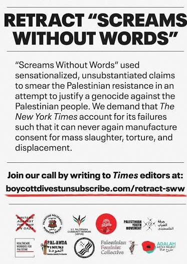 الكوفية نيويورك - تتصاعد المطالبات الشعبية والإعلامية بسحب تقرير "Screams Without Words"، الذي نشرته صحيفة "نيويورك تايمز" قبل عامين، كونه من أكثر المواد الدعائية تأثيراً وخطورة في تغطية الصراع الفلسطيني–الإسرائيلي، خلال العقدين الماضيين.
