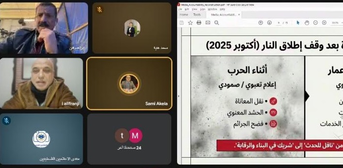 جاء ذلك خلال ورشة عمل إعلامية نظمها "منتدى الإعلاميين الفلسطينيين"، السبت 24 يناير 2026، عبر منصة (جوجل ميت)، تحت عنوان: "دور الإعلام في إسناد وإنجاح لجنة التكنوقراط"، أدارها الإعلامي محمد هنية، بمشاركة نخبة واسعة من الصحفيين والباحثين.