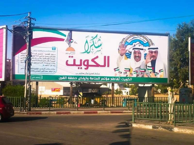 ووضع الفلسطينيون، صورا جمعت أمير الكويت، صباح الأحمد الجابر صباح، ورئيس مجلس الأمة الكويتي، مرزوق الغانم، كتب عليها "شكرًا الكويت".