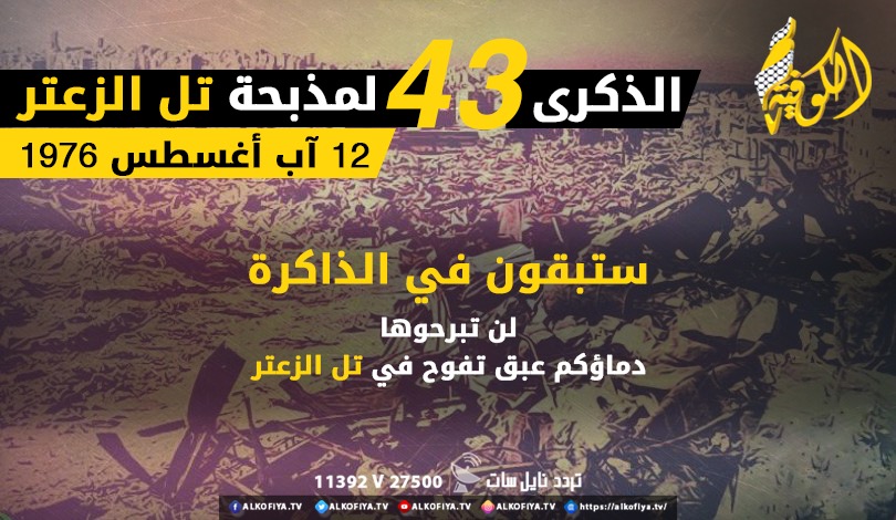 متابعات: تحل اليوم، الإثنين، الذكرى الـ43 على مجزرة "تل الزعتر"، التي بدأت بحصار استمر 52 يوماً في مخيم "تل الزعتر" شمال بيروت، دُك خلالها بأكثر من 55 ألف قذيفة، حصيلتها 4280 قتيلا، غالبيتهم من المدنيين والنساء والأطفال وكبار السن، وآلاف الجرحى وقصص مرعبة لعمليات الذبح الجماعية للاجئين.
