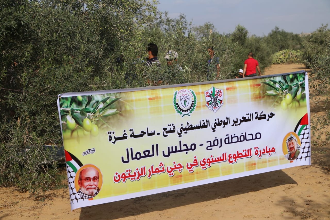 رفح: نظم مجلس العمال في حركة فتح بساحة غزة، اليوم الخميس، فعالية جني ثمار الزيتون في محافظة رفح، في إطار المبادرة السنوية التي أطلقها المجلس لجني ثمار الزيتون في جميع محافظات قطاع غزة.