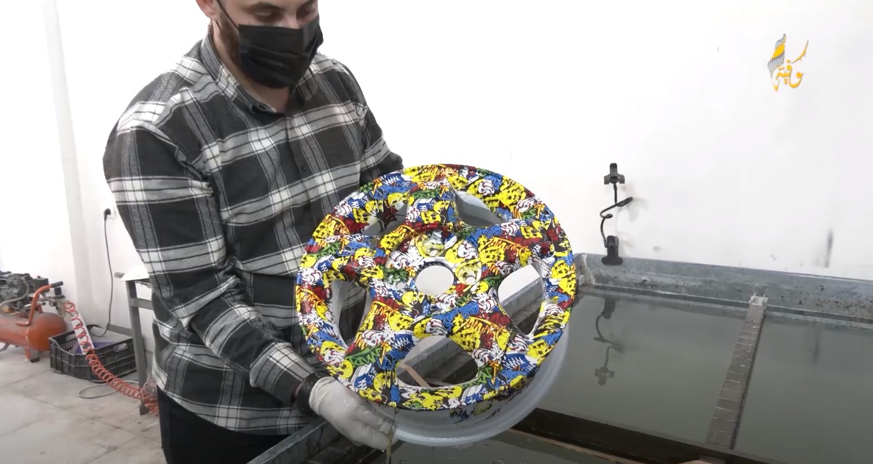 وأشار العسولي، إلى المكونات الرئيسية للطباعة المائية منها، حوض الطباعة المائي، الأفلام، ومادة منشطة، مبيناً الخطوات التي تمر بها الطباعة المائية، حيث أنه يقوم بوضع فيلم "حسب الشكل الذي يريده العميل" على سطح الماء بدرجة حرارة معينة، ومن ثم يقوم برش المادة المنشطة على ذلك الفيلم، وبعد ذلك يتم تغطيس الجسم الذي سيتم طباعة الفيلم عليه، في النهاية يظهر على الجسم الشكل الذي اختاره الزبون.